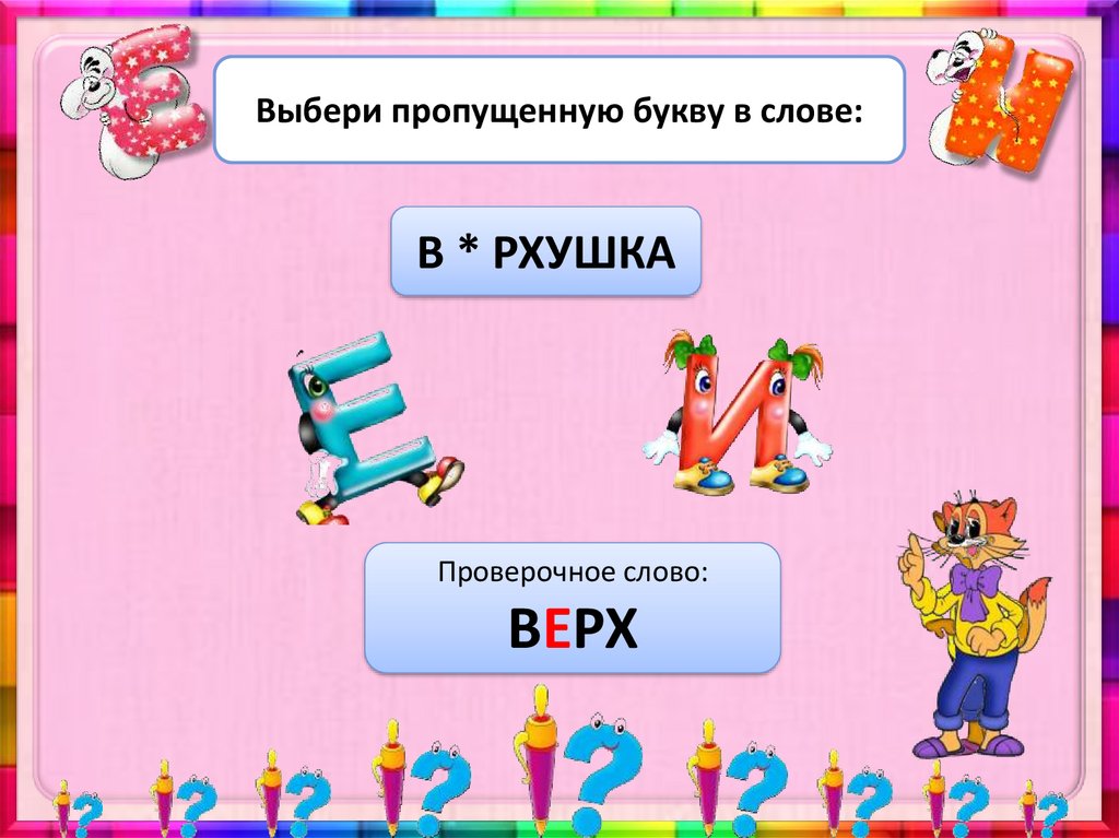 Выбери пропущенную букву в слове:В * РХУШКА