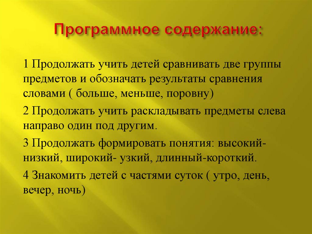 1 Продолжать учить детей сравнивать две группыпредметов и обозначать результаты сравнения
