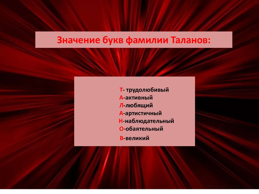 Значение букв фамилии Таланов:Т- трудолюбивый