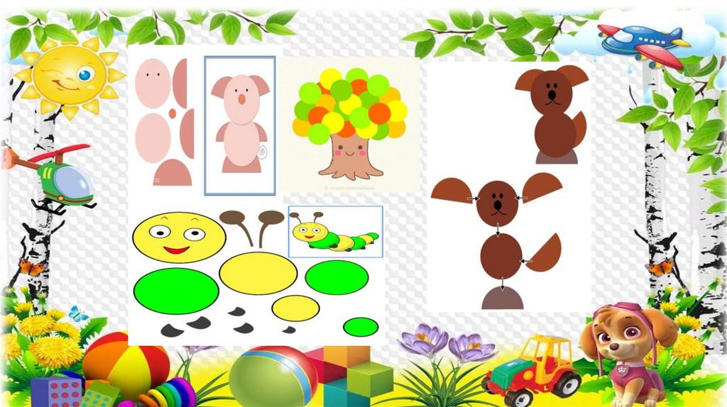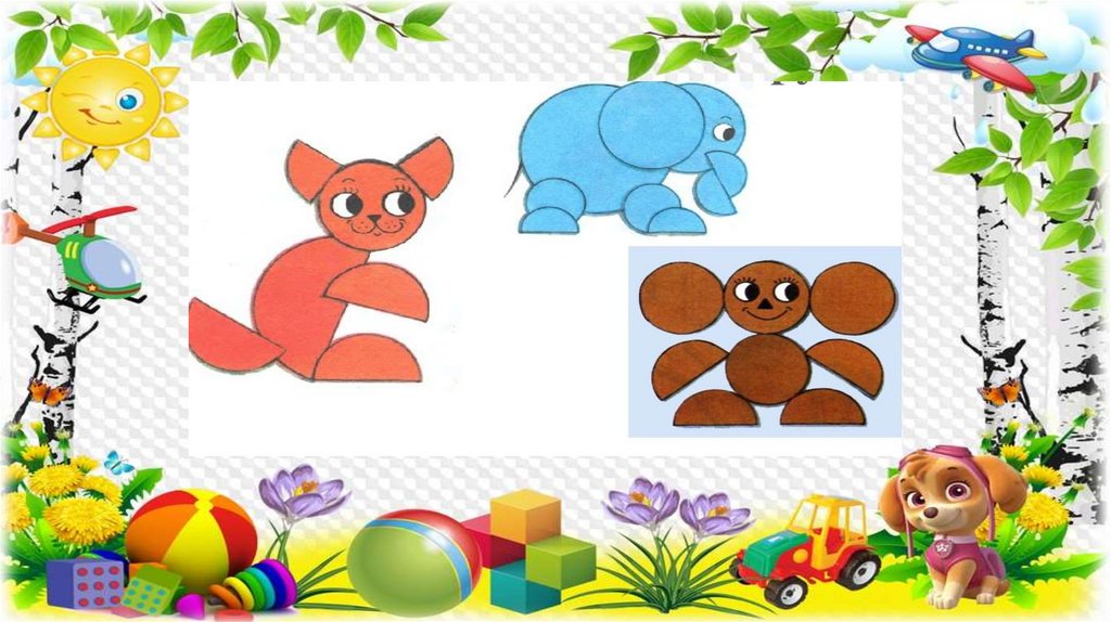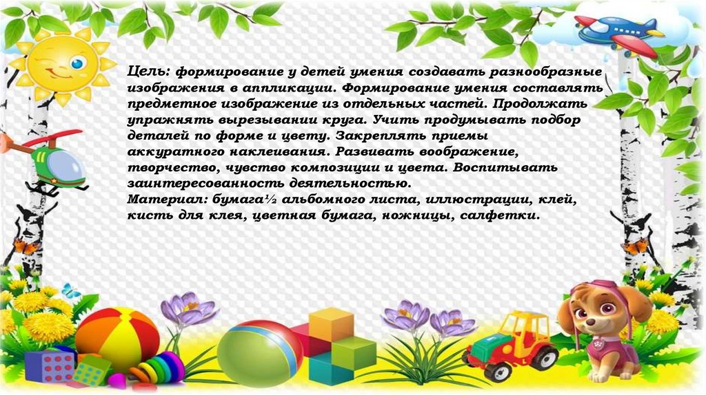 Цель: формирование у детей умения создавать разнообразныеизображения в аппликации. Формирование умения составлять