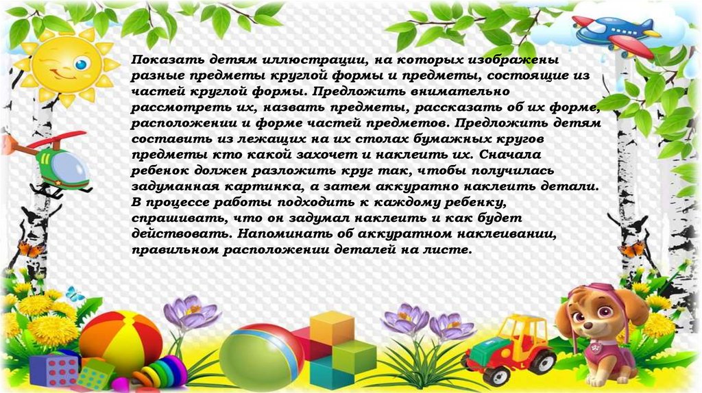 Показать детям иллюстрации, на которых изображеныразные предметы круглой формы и предметы, состоящие из