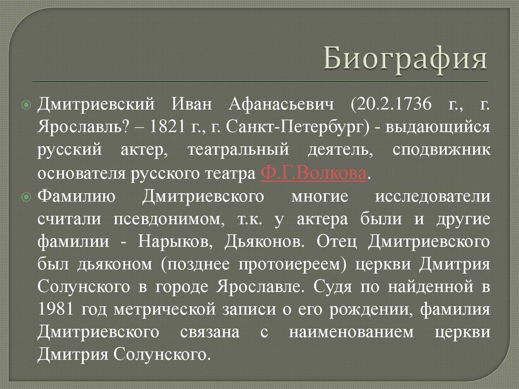Сценический путь Дмитриевскийначал в ярославском театре Волкова