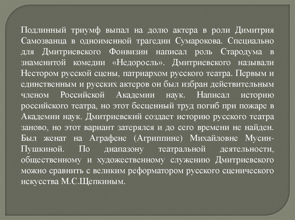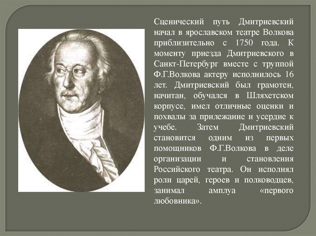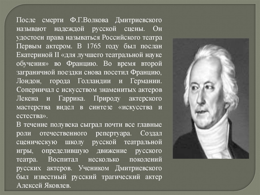 После смерти Ф.Г.Волкова Дмитриевскогоназывают надеждой русской сцены. Он