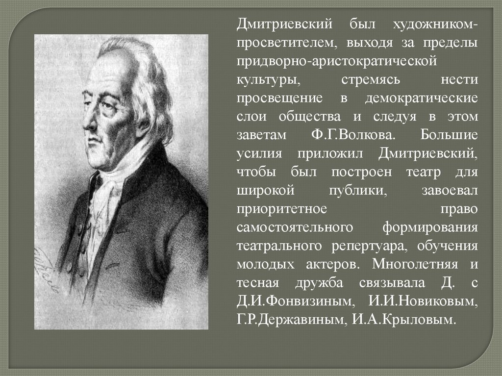 Дмитриевский был художникомпросветителем, выходя за пределыпридворно-аристократической
