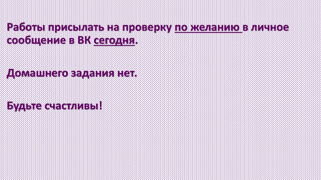 Работы присылать на проверку по желанию в личноесообщение в ВК сегодня.