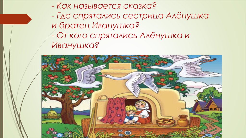 - Как называется сказка?- Где спрятались сестрица Алёнушка