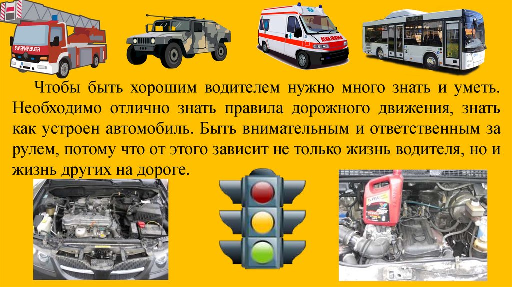 Чтобы быть хорошим водителем нужно много знать и уметь.Необходимо отлично знать правила дорожного движения, знать