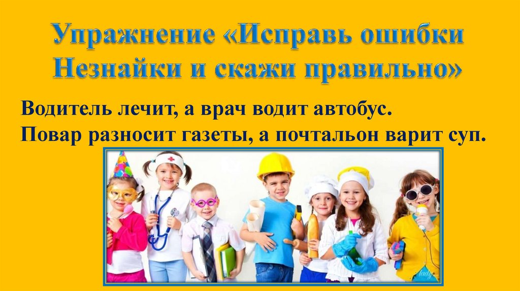 Водитель лечит, а врач водит автобус.Повар разносит газеты, а почтальон варит суп.