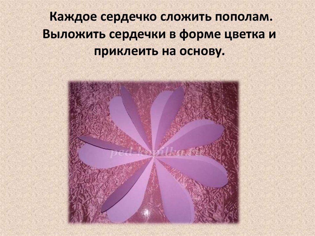 Каждое сердечко сложить пополам.Выложить сердечки в форме цветка и