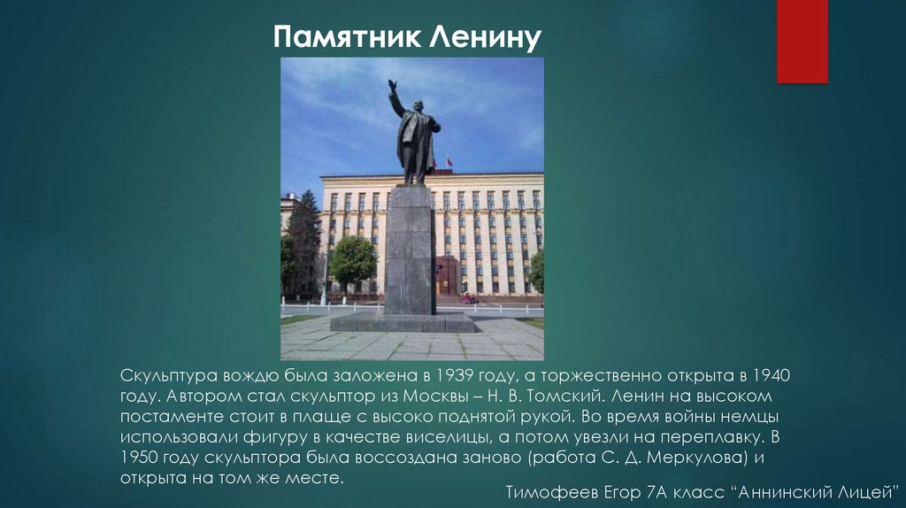году. Автором стал скульптор из Москвы – Н. В. Томский. Ленин на высоком