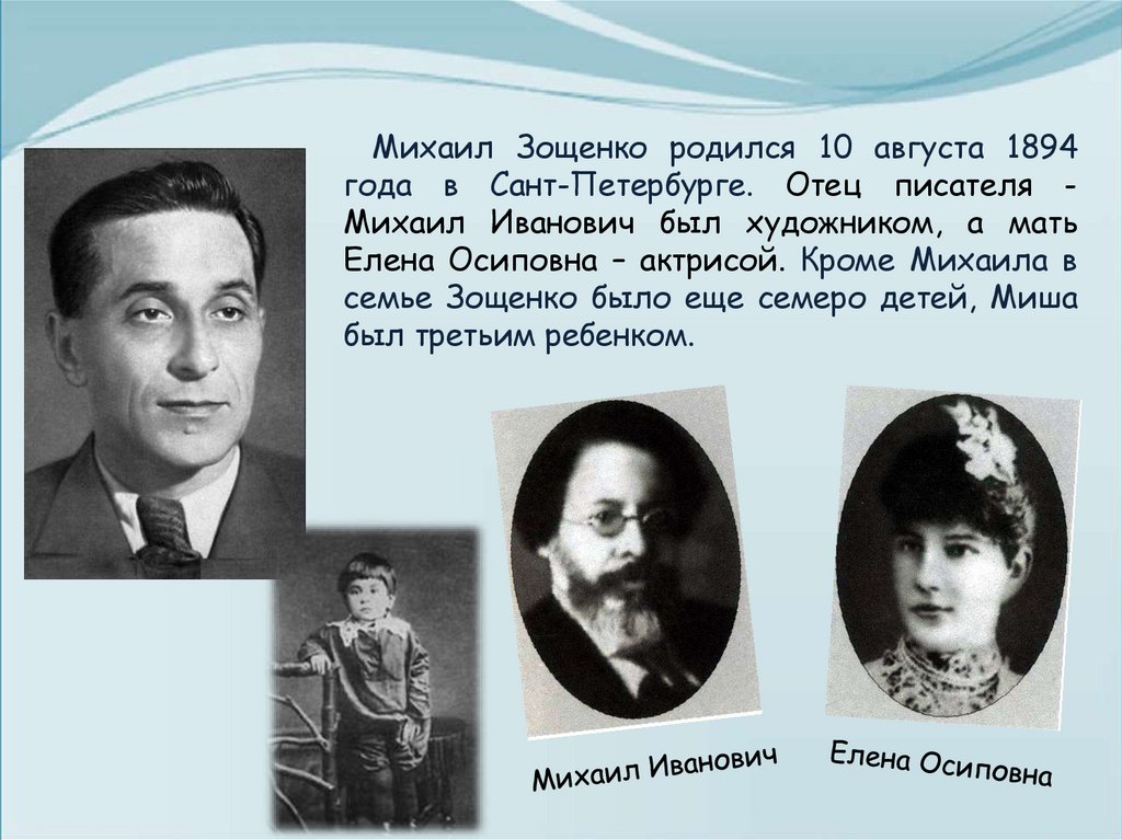 Михаил Зощенко родился 10 августа 1894года в Сант-Петербурге. Отец писателя Михаил Иванович был художником, а мать