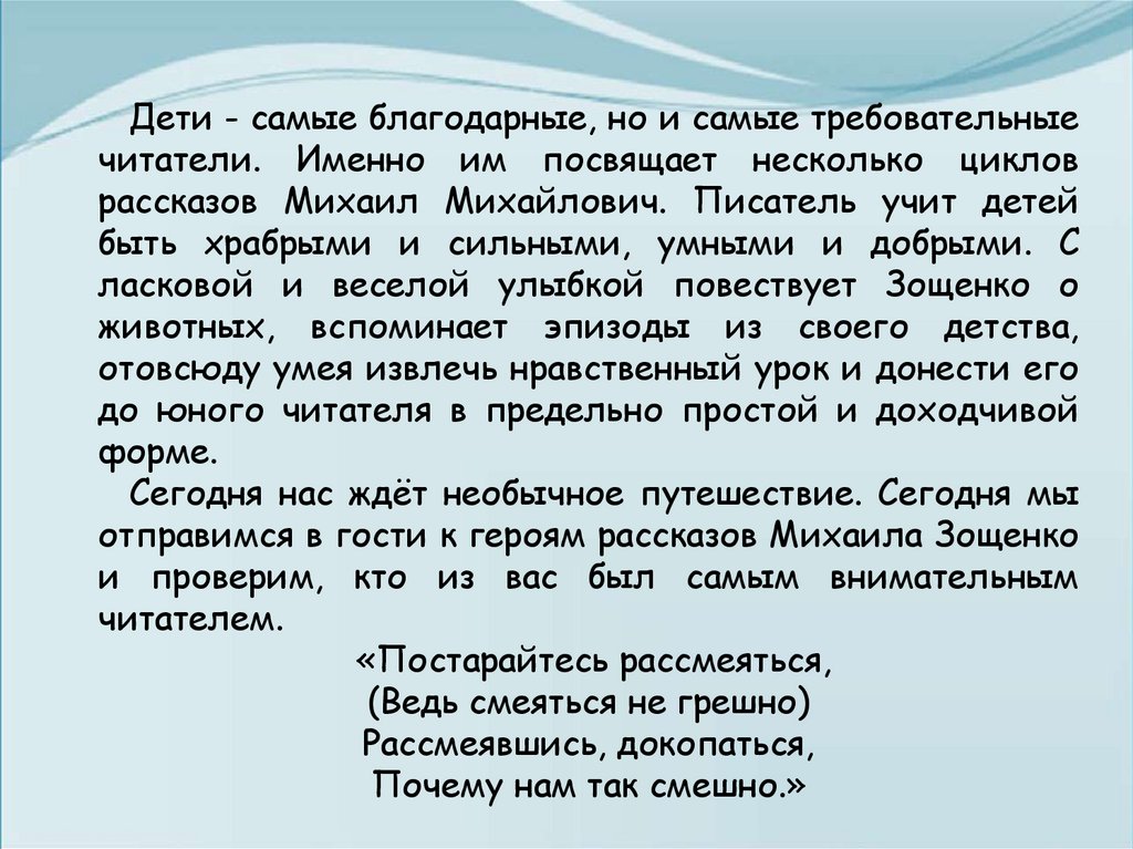 ласковой и веселой улыбкой повествует Зощенко о