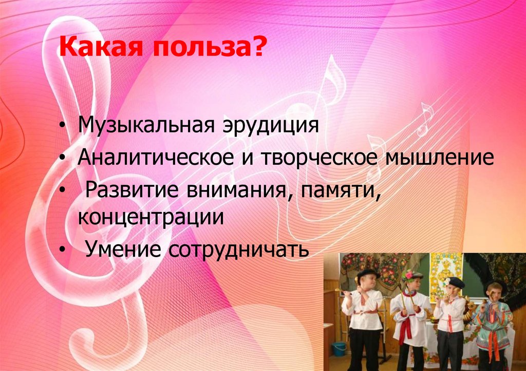 Какая польза?• Музыкальная эрудиция