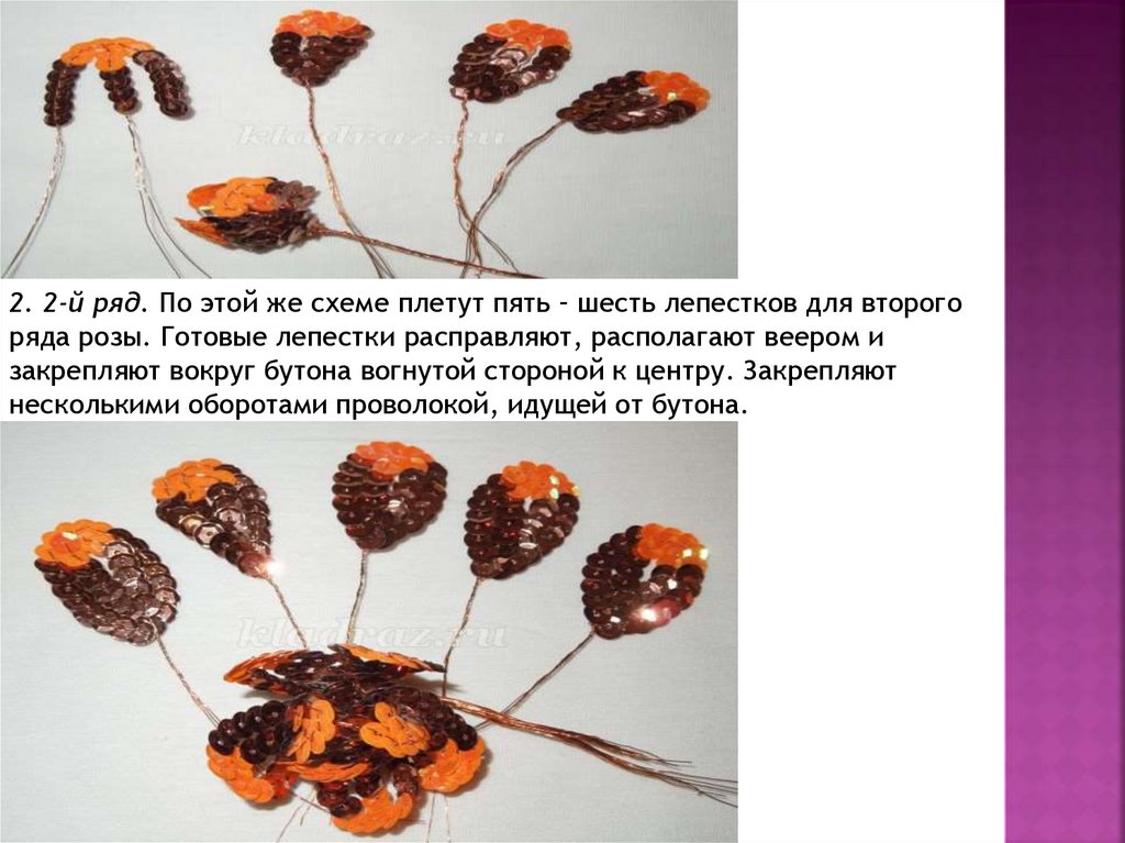 2. 2-й ряд. По этой же схеме плетут пять – шесть лепестков для второгоряда розы. Готовые лепестки расправляют, располагают веером и