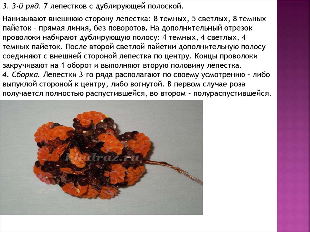 3. 3-й ряд. 7 лепестков с дублирующей полоской.Нанизывают внешнюю сторону лепестка: 8 темных, 5 светлых, 8 темных