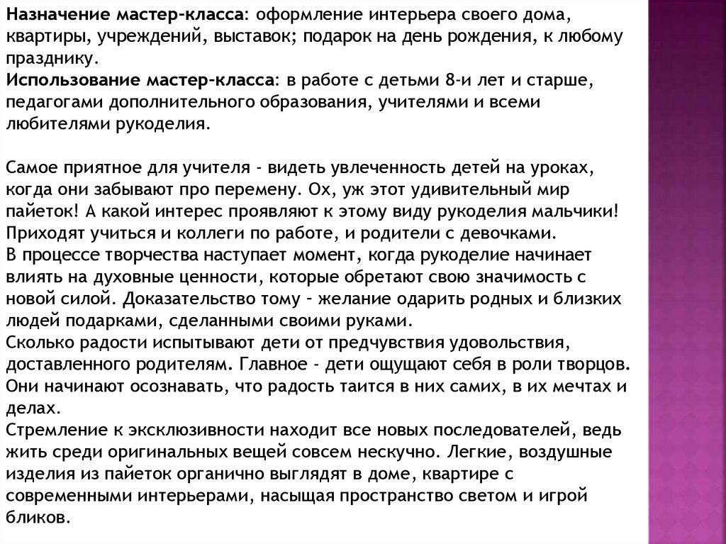 Использование мастер-класса: в работе с детьми 8-и лет и старше,