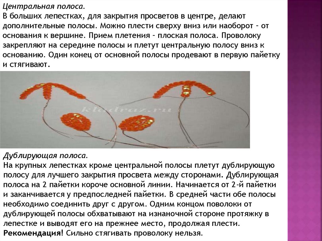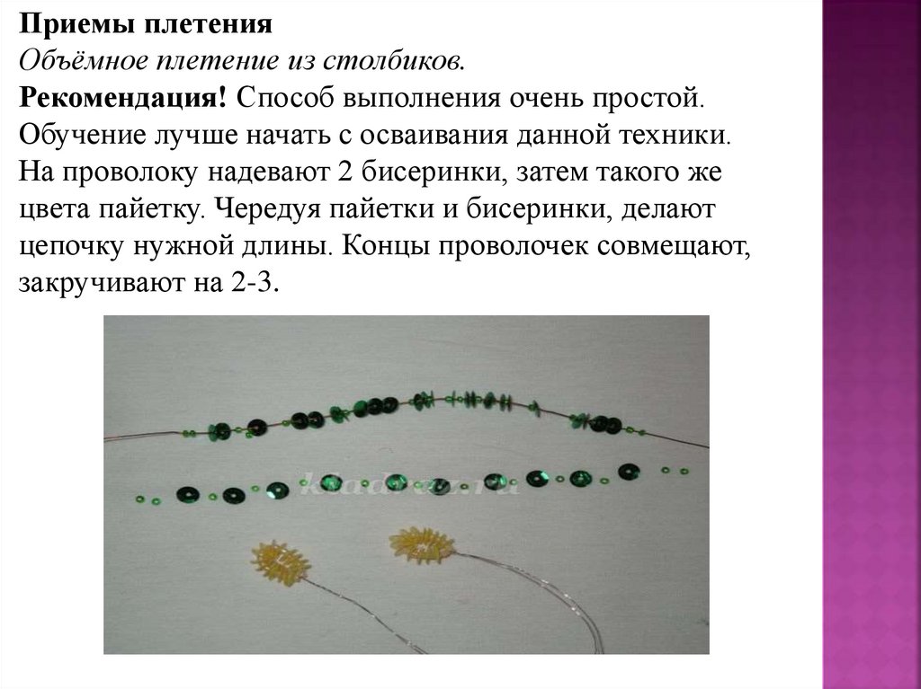 пайеток. Концы проволоки не соединяют. Центральную полосу плетут
