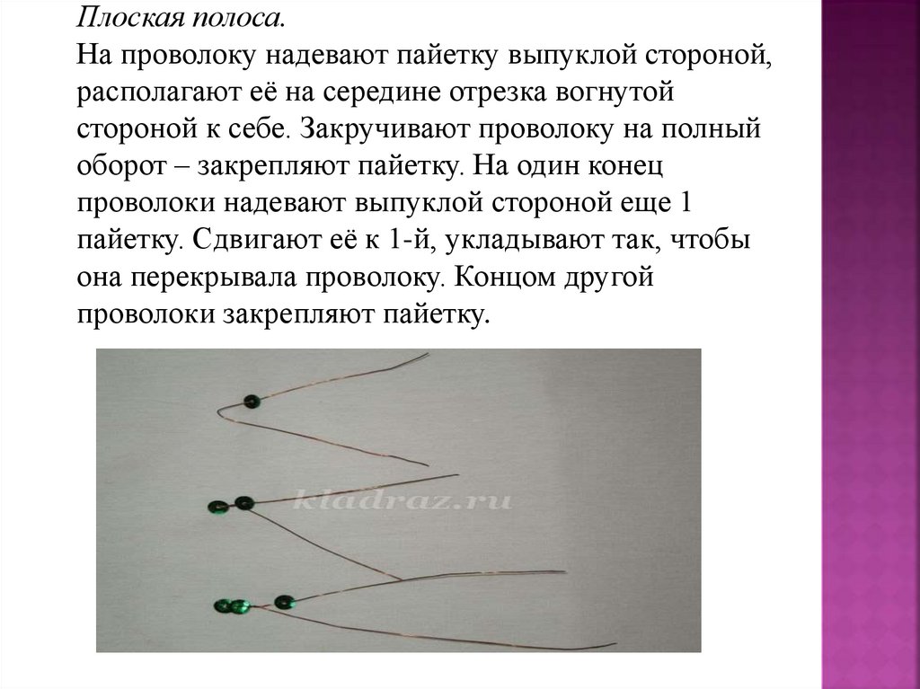 Плоская полоса.На проволоку надевают пайетку выпуклой стороной,