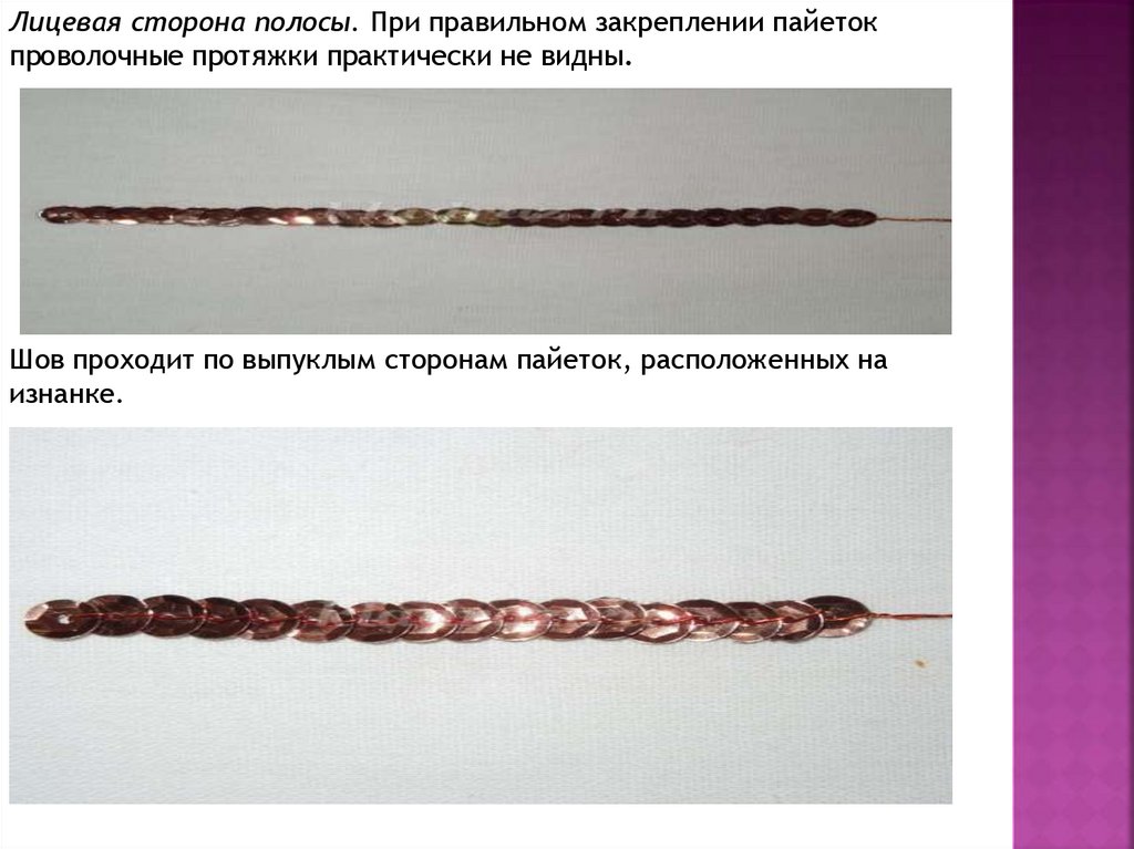 Лицевая сторона полосы. При правильном закреплении пайетокпроволочные протяжки практически не видны.