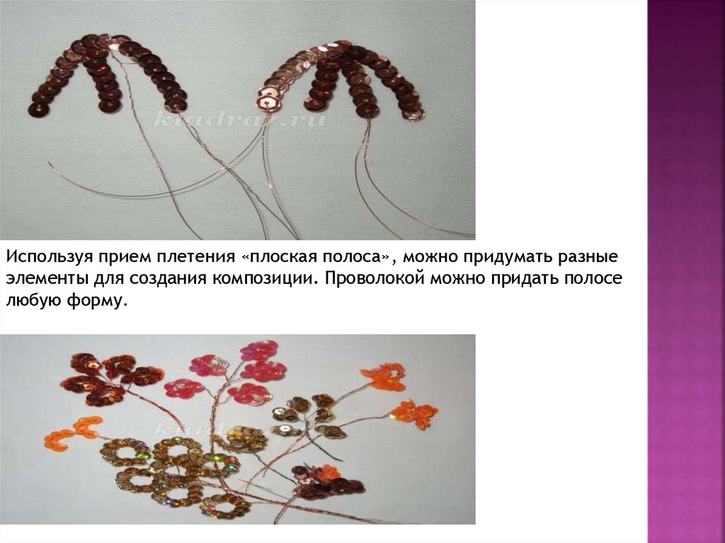 Используя прием плетения «плоская полоса», можно придумать разныеэлементы для создания композиции. Проволокой можно придать полосе