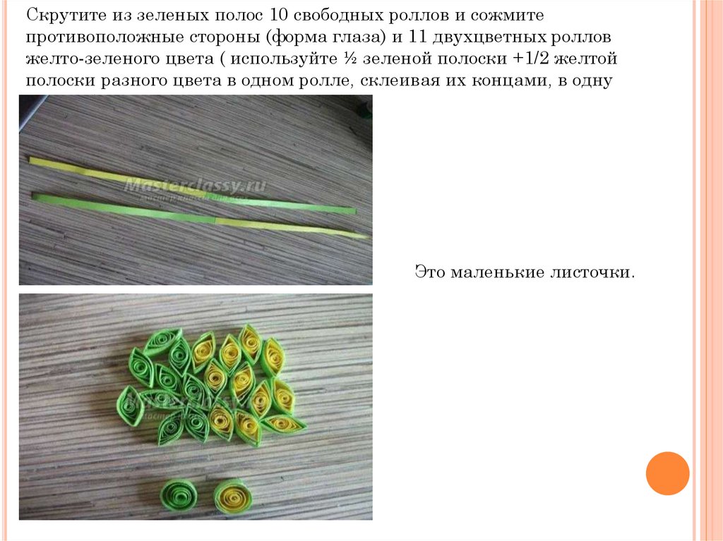 Скрутите из зеленых полос 10 свободных роллов и сожмитепротивоположные стороны (форма глаза) и 11 двухцветных роллов
