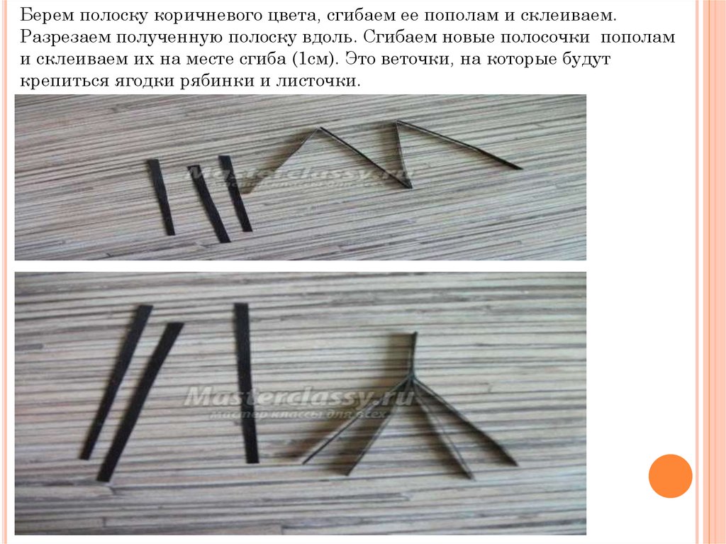 Берем полоску коричневого цвета, сгибаем ее пополам и склеиваем.Разрезаем полученную полоску вдоль. Сгибаем новые полосочки пополам