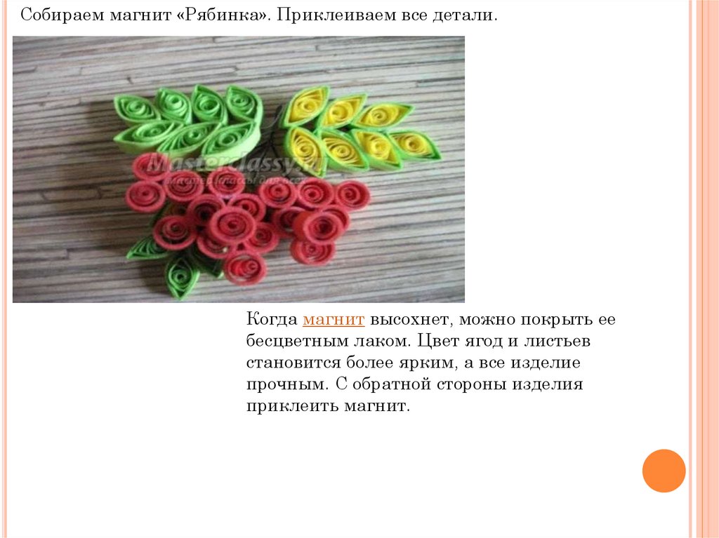 Собираем магнит «Рябинка». Приклеиваем все детали.Когда магнит высохнет, можно покрыть ее