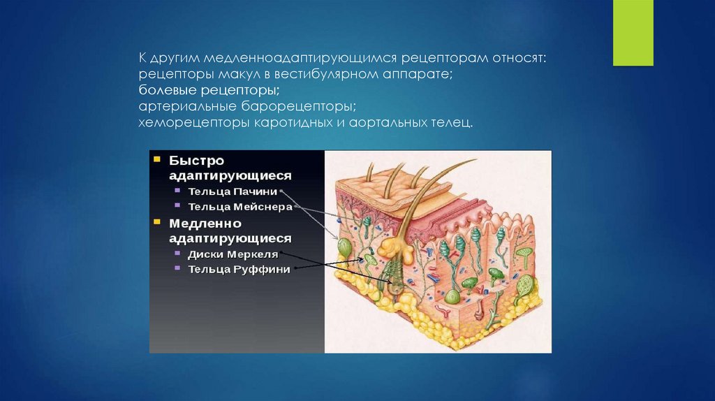 К другим медленноадаптирующимся рецепторам относят:рецепторы макул в вестибулярном аппарате;