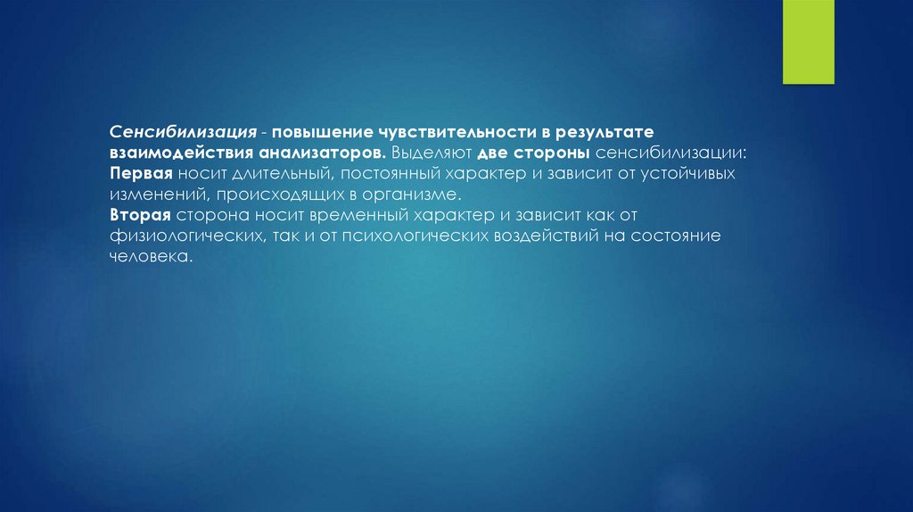 Сенсибилизация - повышение чувствительности в результатевзаимодействия анализаторов. Выделяют две стороны сенсибилизации: