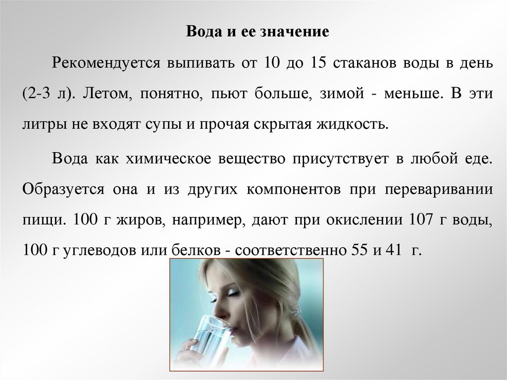 Вода и ее значениеРекомендуется выпивать от 10 до 15 стаканов воды в день