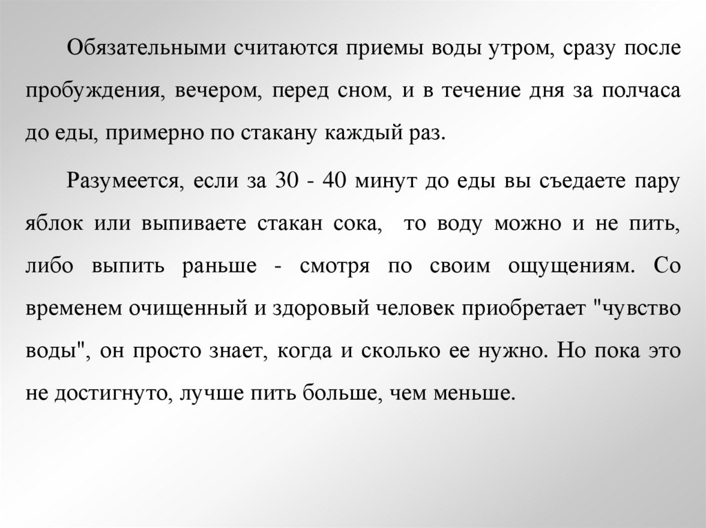 Обязательными считаются приемы воды утром, сразу послепробуждения, вечером, перед сном, и в течение дня за полчаса