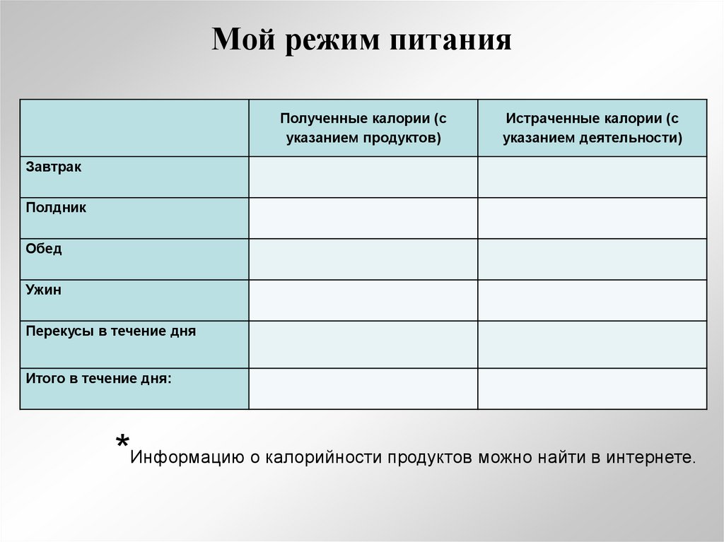 *Информацию о калорийности продуктов можно найти в интернете.