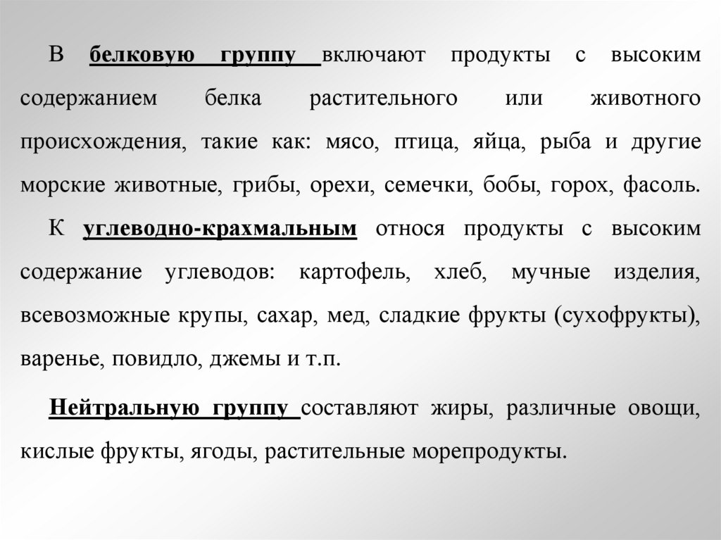 Всего выделяется три группы продуктовбелковые