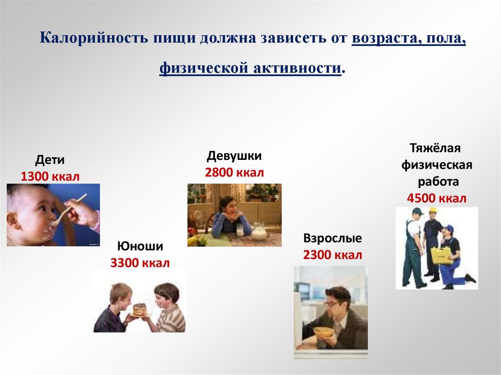 Калорийность пищи должна зависеть от возраста, пола,физической активности.