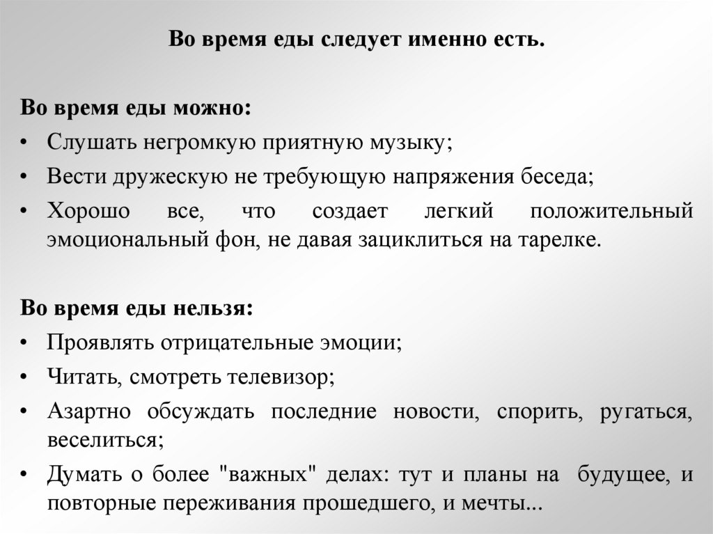 Во время еды следует именно есть.Во время еды можно: