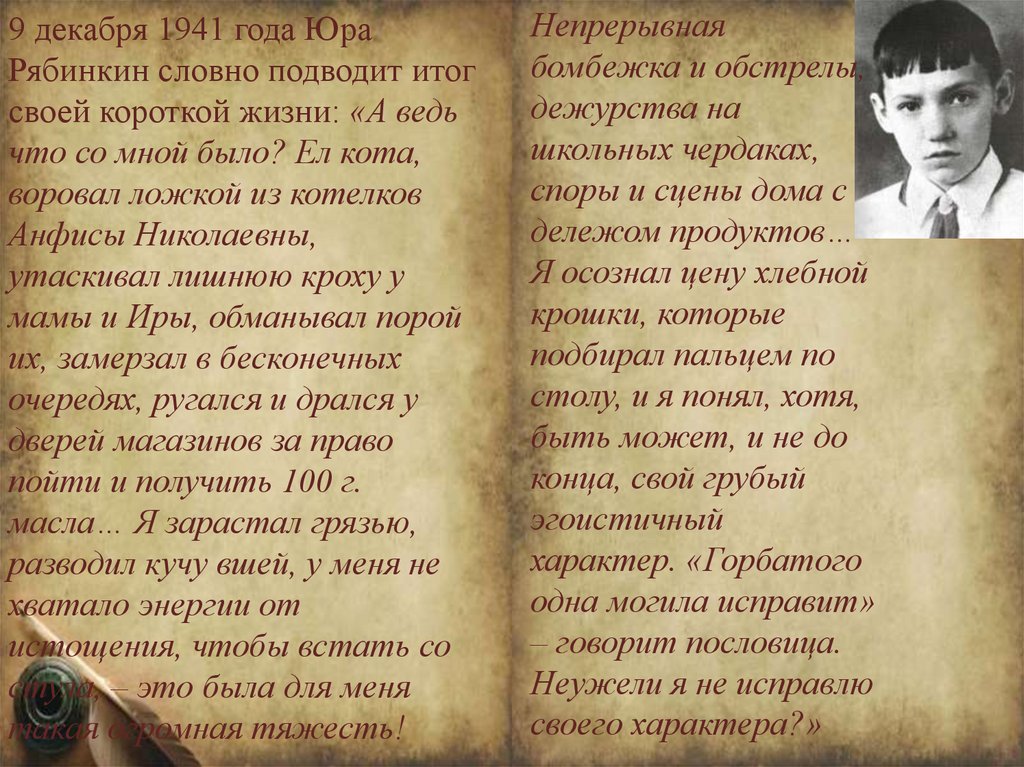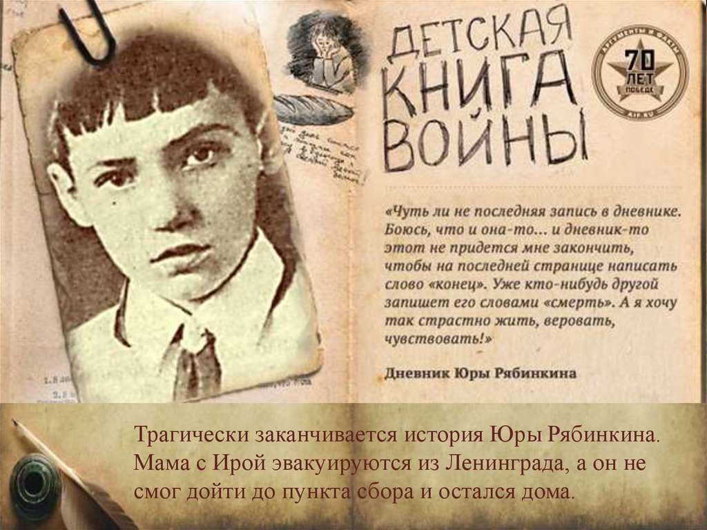 Трагически заканчивается история Юры Рябинкина.Мама с Ирой эвакуируются из Ленинграда, а он не