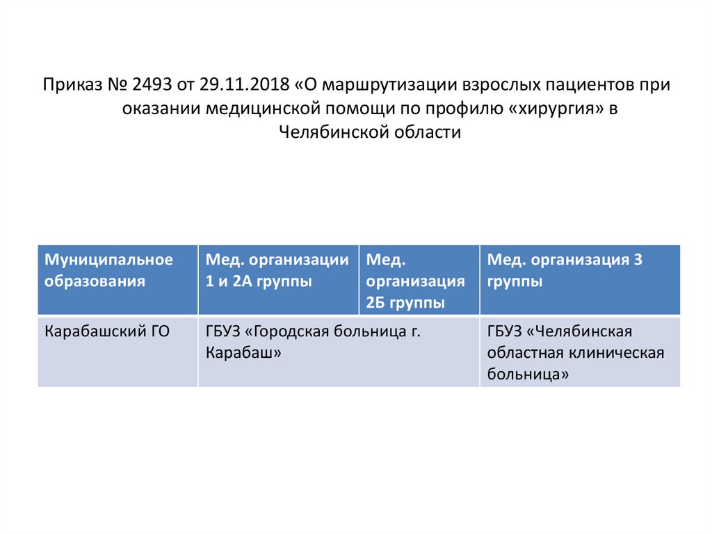 Приказ № 2493 от 29.11.2018 «О маршрутизации взрослых пациентов приоказании медицинской помощи по профилю «хирургия» в