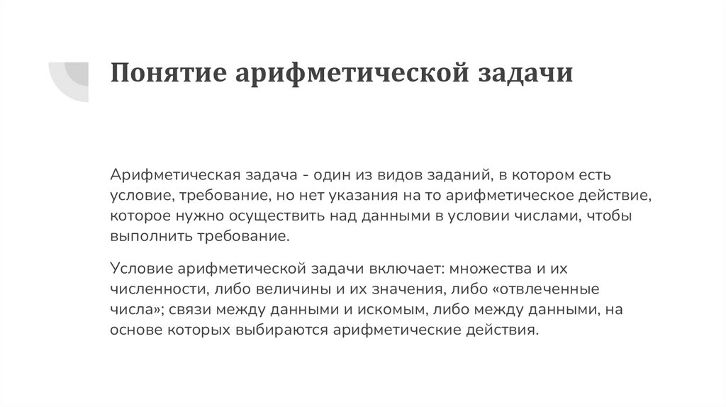Понятие арифметической задачиАрифметическая задача - один из видов заданий, в котором есть