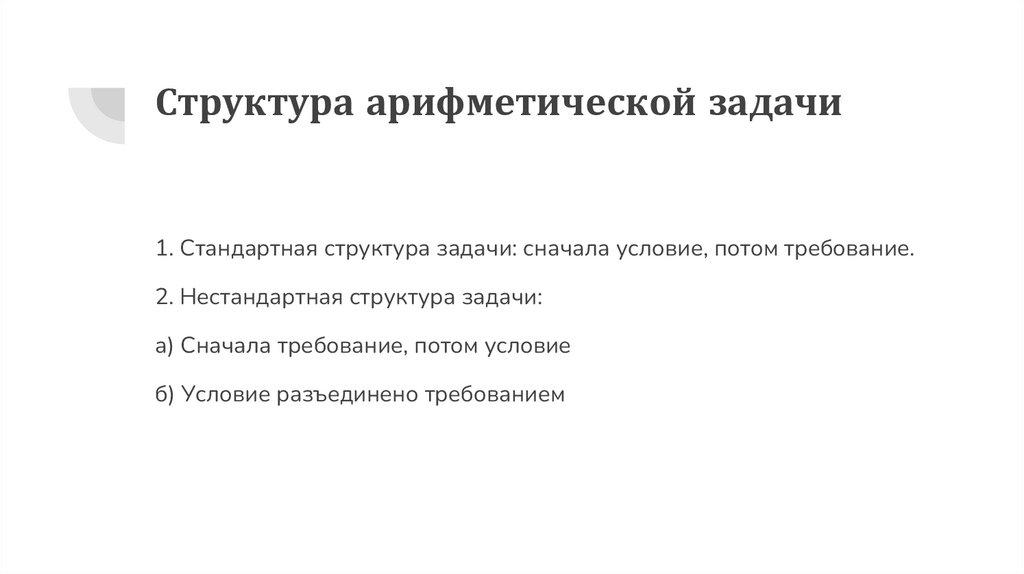 Структура арифметической задачи1. Стандартная структура задачи: сначала условие, потом требование.