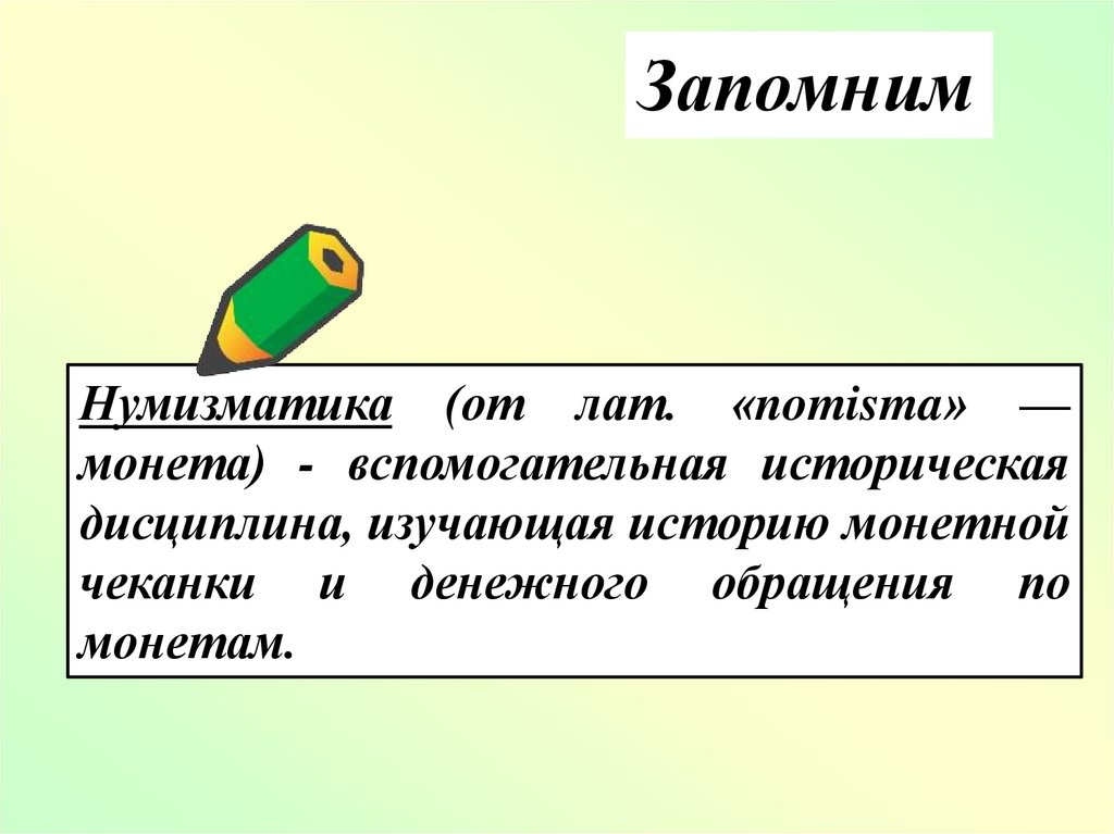 ЗапомнимНумизматика (от лат. «nomisma» —