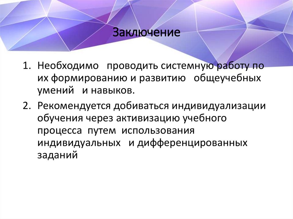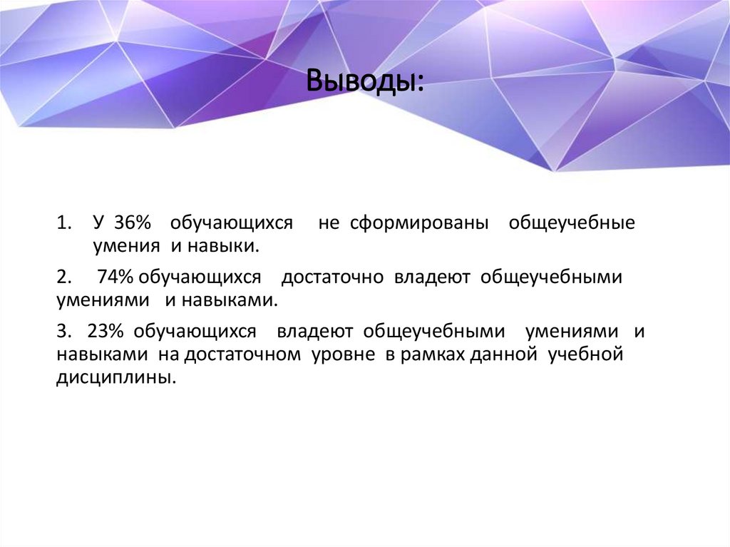 Выводы:1. У 36% обучающихся не сформированы общеучебные