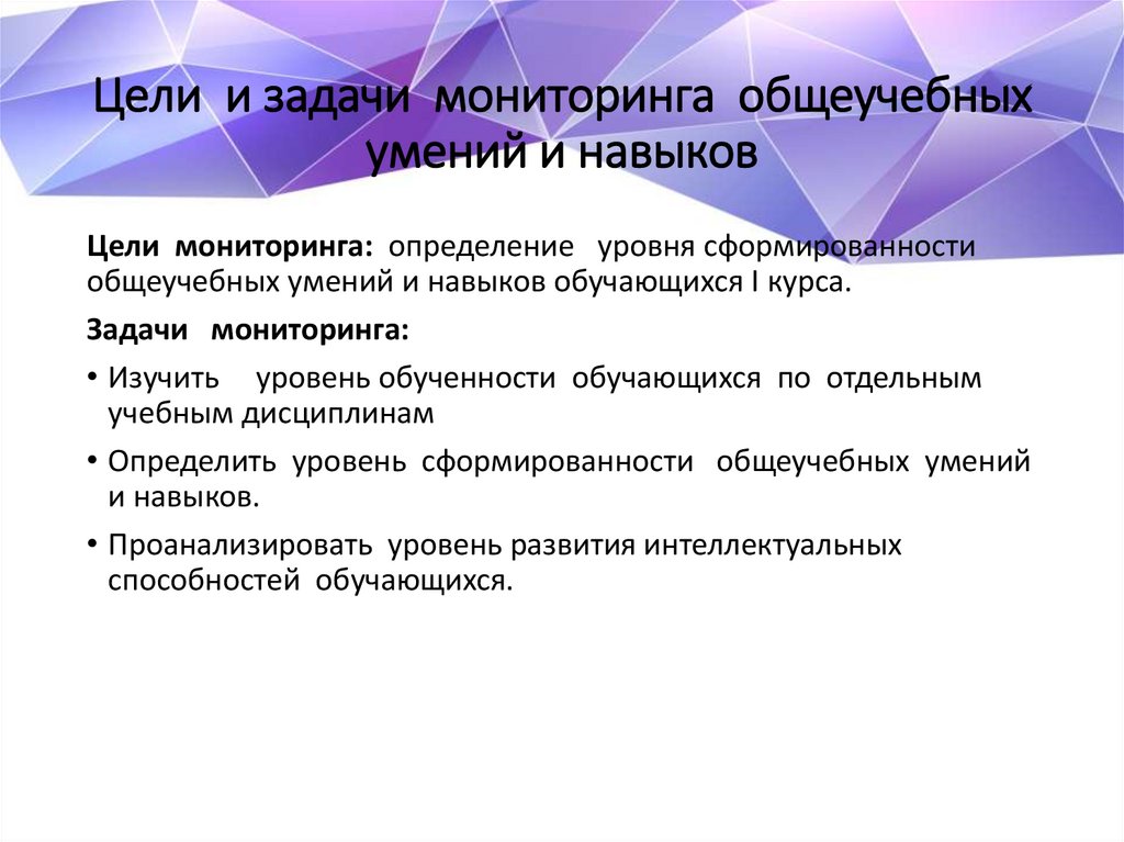 Цели и задачи мониторинга общеучебныхумений и навыков