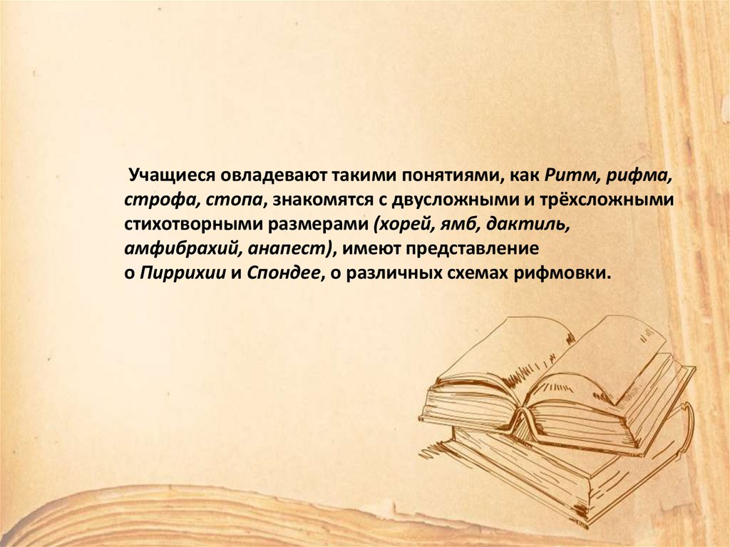 Учащиеся овладевают такими понятиями, как Ритм, рифма,строфа, стопа, знакомятся с двусложными и трёхсложными