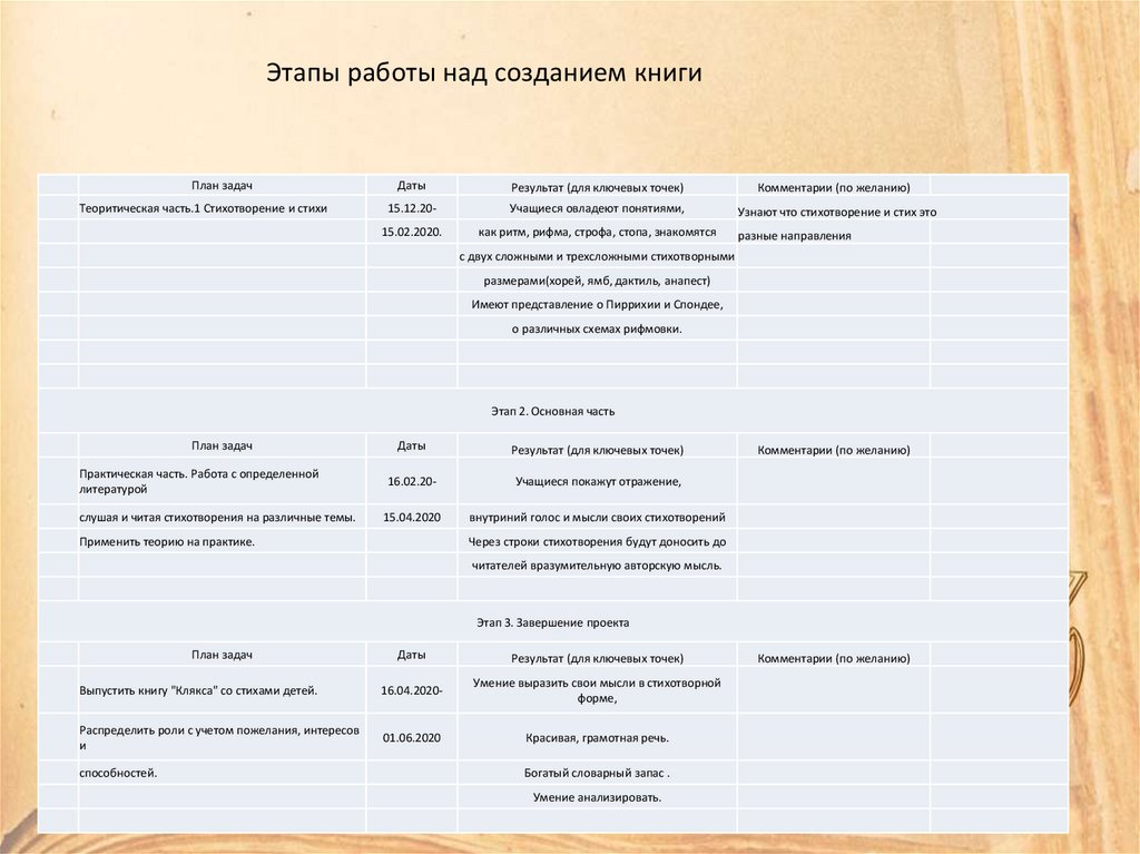 Этапы работы над созданием книгиПлан задач