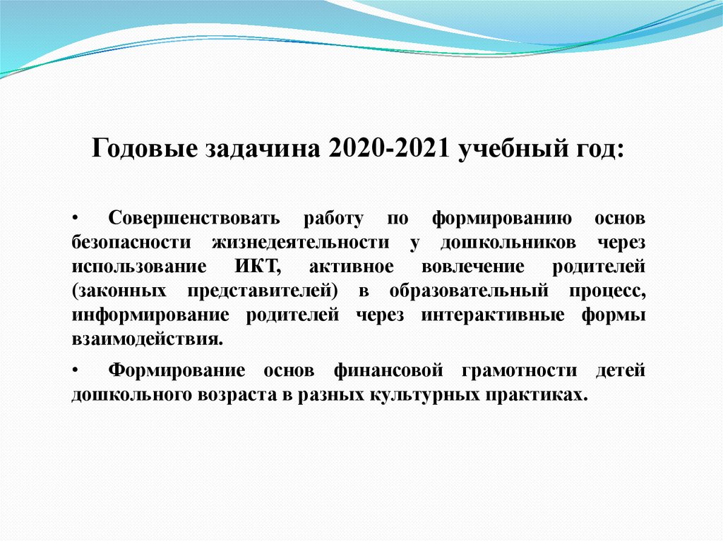 Годовые задачина 2020-2021 учебный год:• Совершенствовать работу по формированию основ