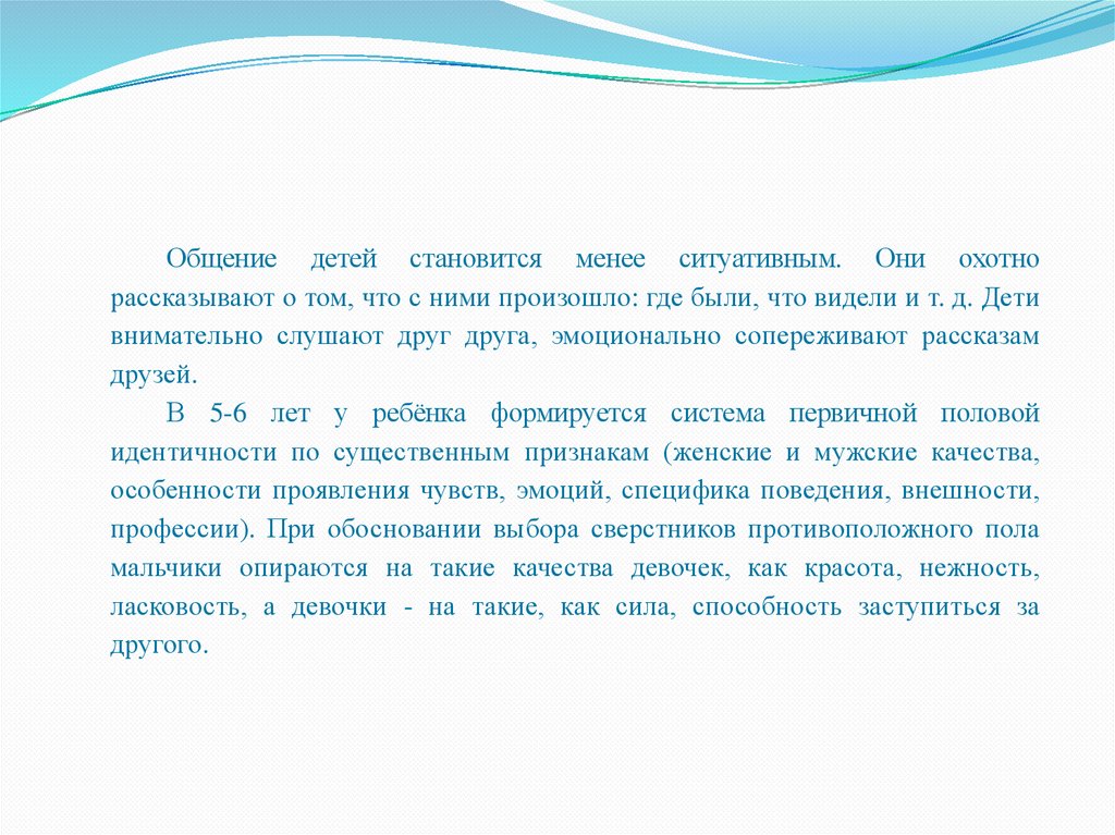 Общение детей становится менее ситуативным. Они охотнорассказывают о том, что с ними произошло: где были, что видели и т. д. Дети