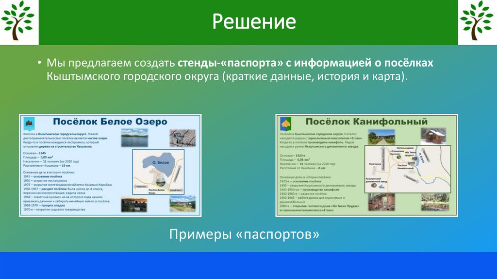 Решение• Мы предлагаем создать стенды-«паспорта» с информацией о посёлках