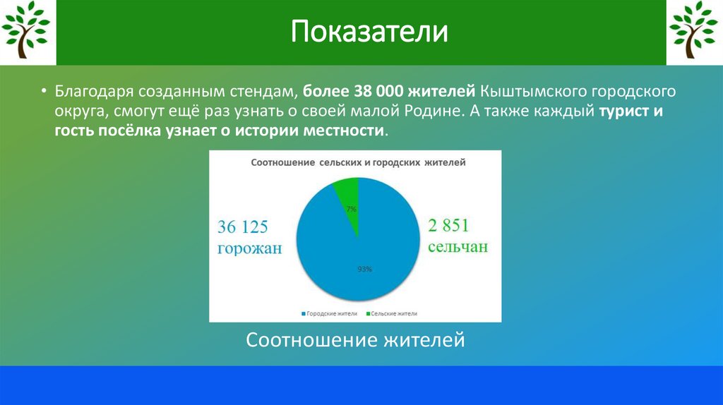 Показатели• Благодаря созданным стендам, более 38 000 жителей Кыштымского городского