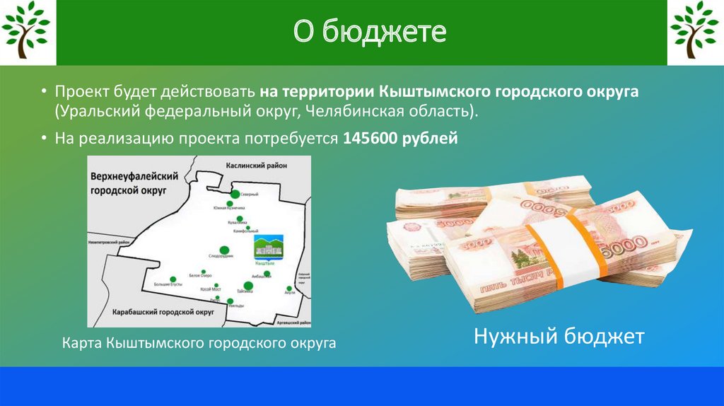 О бюджете• Проект будет действовать на территории Кыштымского городского округа