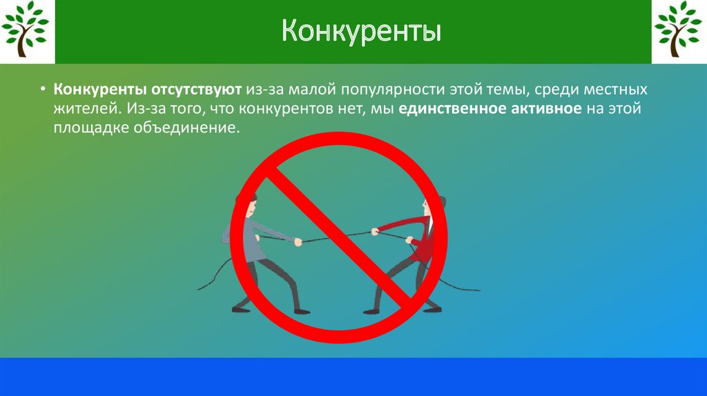 Конкуренты• Конкуренты отсутствуют из-за малой популярности этой темы, среди местных